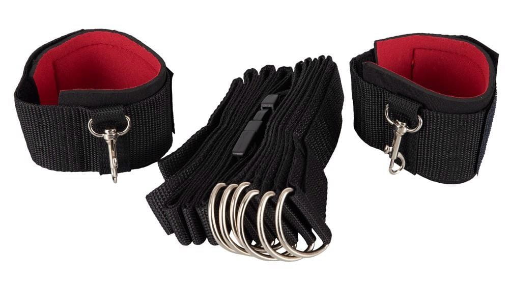 Zamienia każdy plac zabaw w zabawną ławeczkę do bondage!Regulowany pas do łóżka (4,5 m długości) można przymocować wokół każdej ramy łóżka. Wyściełane mankiety na nadgarstki z karabińczykami można teraz zaczepić na 6 metalowych oczkach.