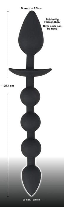 Jedna sex zabawka dwa stymulatory, klasyczny korek analny z przewężeniem i ogranicznikiem głębokości wprowadzenia, oraz stopniowanej wielkości pręt z koralikami o średnicy do 2,5 centymetra. Zabawka analna idealna dla początkujących z praktykami analnymi, wykonana z higienicznego silikonu medycznego o świetnych właściwościach ślizgowych.