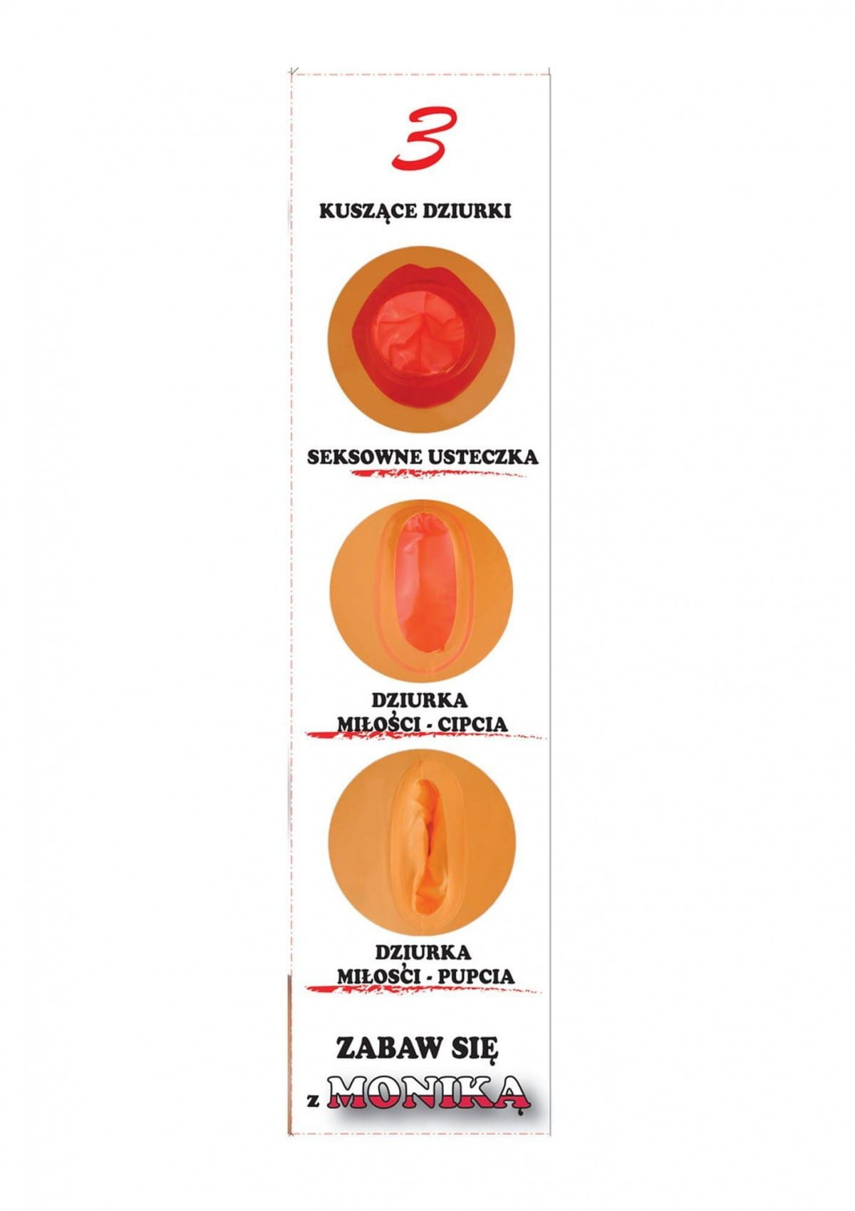 Jej nadmuchiwany design i trzy otwory do penetracji (usta, wagina, anus) zapewniają autentyczne doznania. Malowane imitacje twarzy i włosów nadają lalce realistyczny wygląd, a stojąca pozycja dodaje jej atrakcyjności.