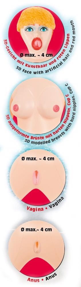 Ta dmuchana lalka dla dorosłych jest idealna do spełniania skrytych fantazji erotycznych, zaspokajania męskich żądz oraz realizacji wyuzdanych pragnień. Wysokość lalki wynosi około 150 cm, a dzięki nadmuchiwanej zawórce, jej użytkowanie jest proste i wygodne. Posiada trzy otwory do penetracji: usta, waginę i odbyt, co zapewnia różnorodność w doznaniach.
